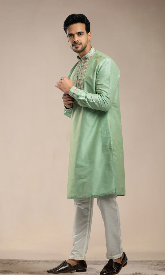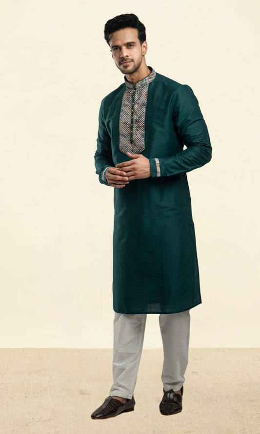 RAMA GREEN THREADWORK KURTA WITH POTLI BUTTONS & PRINTED CUFF SLEEVES