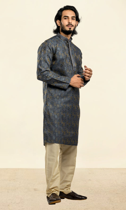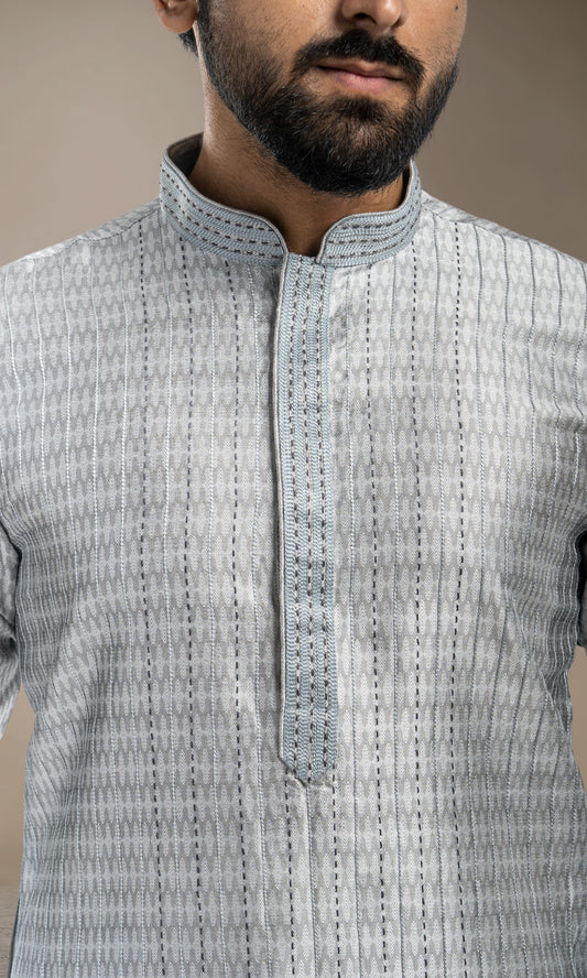 STEEL GREY WEAVED ETHNIC MOTIFS WITH KATHA STITCH KURTA