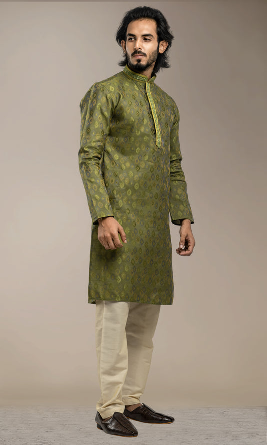 JUNIPER GREEN WEAVED ETHNIC MOTIFS KURTA WITH THREAD WORK EMBRIODERY