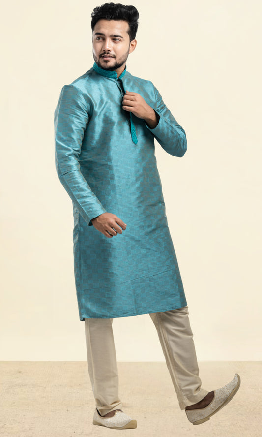DEEP TURQUOISE WEAVED ETHNIC MOTIFS KURTA WITH EMBRIODERY