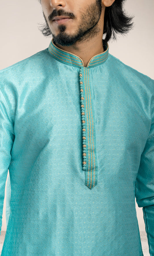 TURQUOISE HARLEQUIN STYLE WEAVED KURTA WITH THREAD WORK EMBRIODERY