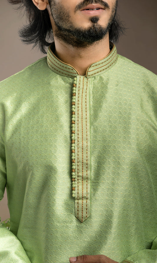 LEAF GREEN HARLEQUIN STYLE WEAVED KURTA WITH THREAD WORK EMBRIODERY
