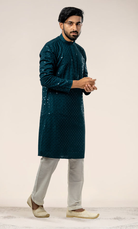 TEAL BLUE SEQUIN EMBELLISHED CHIKANKARI KURTA