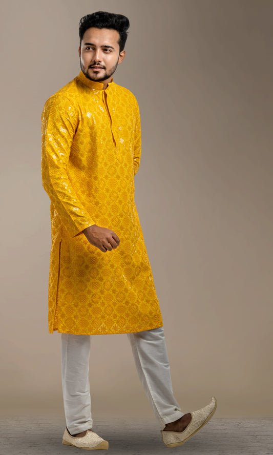 YELLOW SEQUIN EMBELLISHED CHIKANKARI KURTA