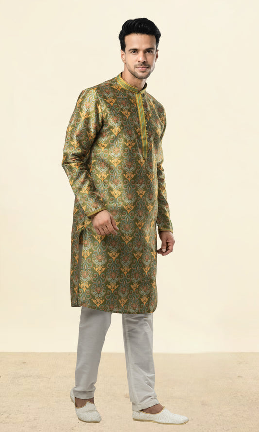 Handwoven Basket Illusion Kurta in Muted Gold & Sage