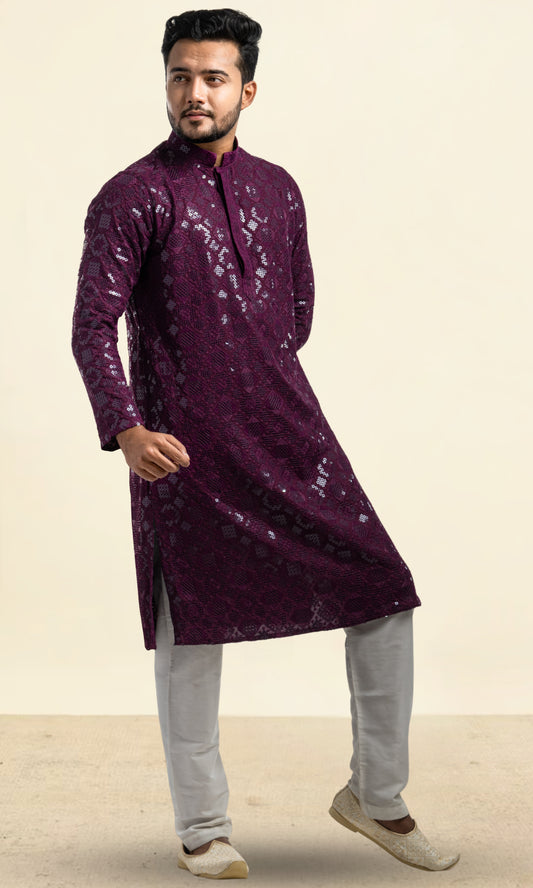WINE SEQUIN EMBELLISHED CHIKANKARI KURTA