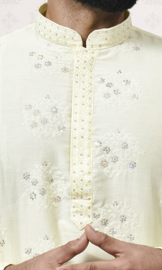 Golden Buttercream Kurta with Delicate Crystal & Floral Embroidery